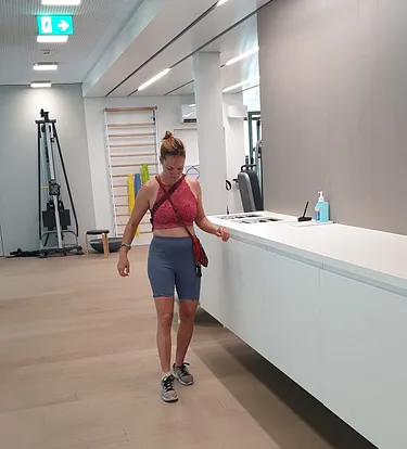 Sie kann auf ihr linkes Bein stehen und das rechte hochziehen. Das rechte, stark geschwächte Bein, hebt sie bereits bis neunzig Grad. Beim Training braucht sie weniger visuelle Kontrolle, da sie ihrer Körperwahrnehmung wieder vertraut.