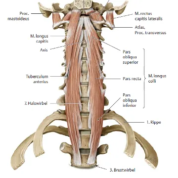 © Prometheus, LernAtlas der Anatomie, Thieme, Stuttgart. Im Vergleich dazu zeigt das Bild hier die tiefliegenden Muskeln (M. longus colli)