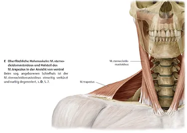© Prometheus, LernAtlas der Anatomie, Thieme, Stuttgart. Auf dem Bild sind die grossen, oberflächlichen Muskeln wie der M. sternocleidomastoideus und Anteile des M. trapezius ersichtlich