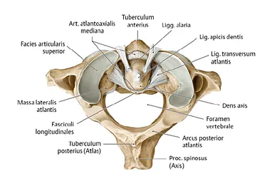 © Prometheus, LernAtlas der Anatomie, Thieme, Stuttgart. Auf dem Bild wird der erste (Atlas C1) und zweite Halswirbel (Axis C2) von oben dargestellt. Darauf erkennt man die Bänder (Ligg. alaria und das Lig. transversum atlantis), welche den Dens axis (Knochenzahn) von C2 an C1 stabilisieren.